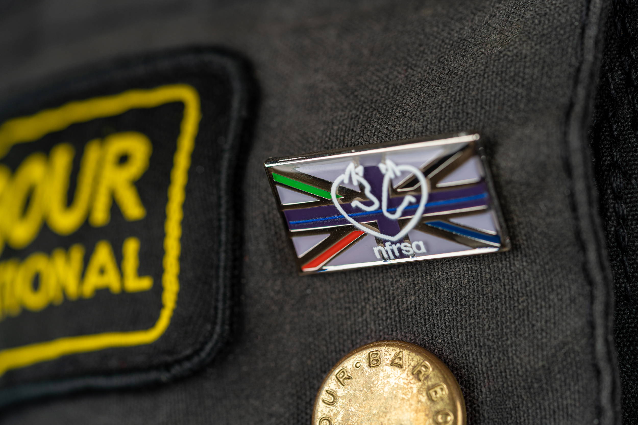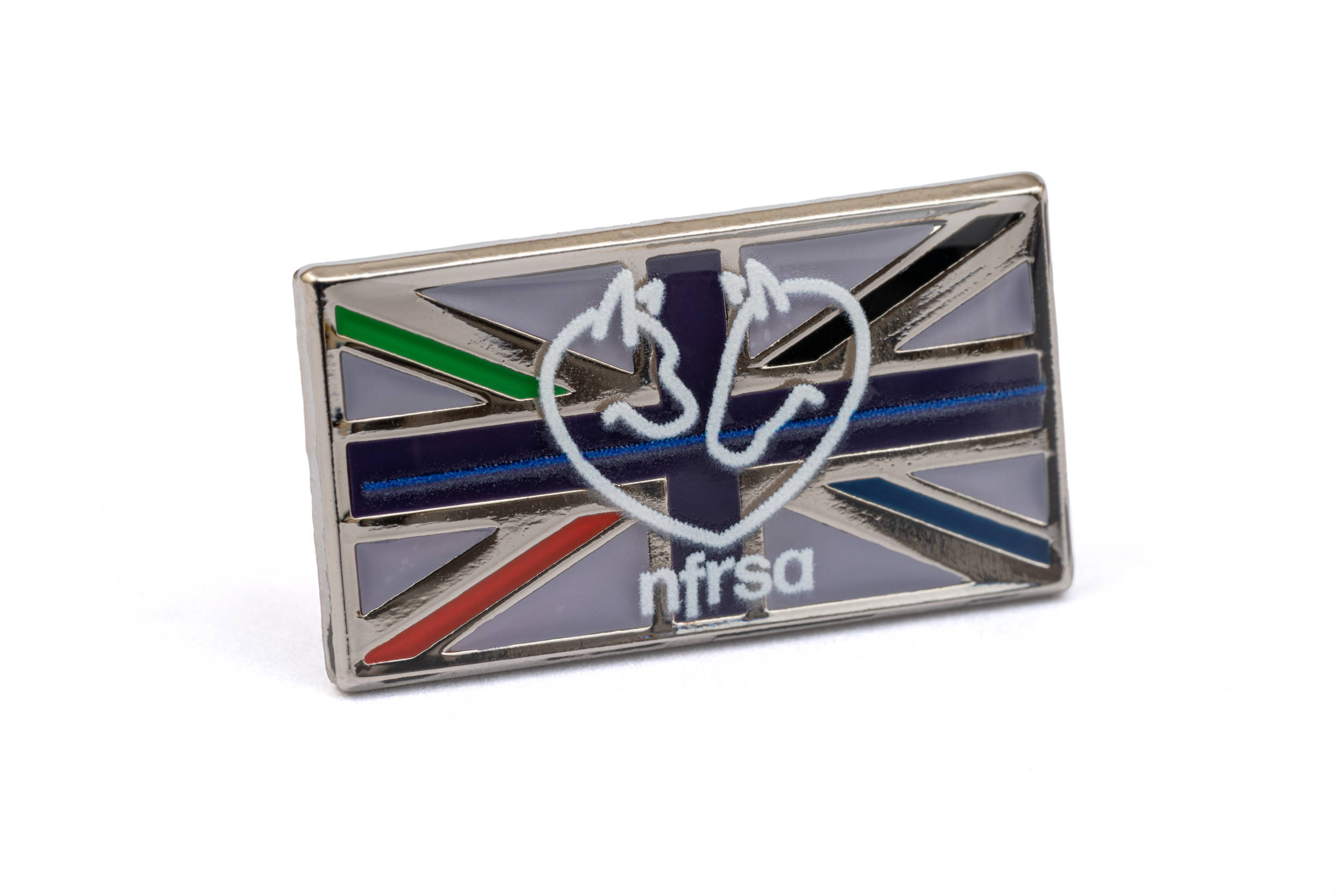 Oblong enamel pin with the NFRSA logo in the centre of the NFRSA Union Jack, depicting the five services we all support.